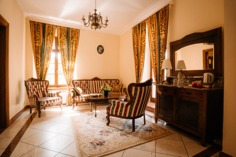Pokój dwuosobowy z łóżkiem małżeńskim. Pokój z widokiem na pełną zieleni pałacową skarpę oraz dwa z naszych stawów. O poranku obudzą Was w nim promienie wschodzącego słońca lub widok mgły radiacyjnej ze zbiorników wodnych. Śpiew ptaków w pakiecie.